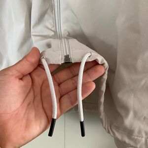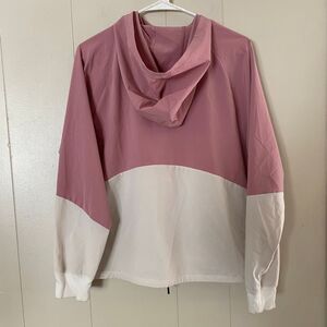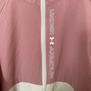Stylish and sporty Under Armour full-zip hooded windbreaker in a beautiful mauve pink and beige colorblock design. Features a loose, relaxed fit, adjustable drawstring hem, side pockets, and lightweight wind-resistant fabric — perfect for layering or everyday wear. Great for athleisure, errands, or outdoor walks.