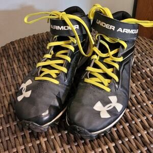 Under Armour Armourbound men’s football cleats, size 8.5. Black and white uppers with neon yellow laces and supportive hook-and-loop ankle strap. Designed for performance with durable traction cleats and lightweight high-top construction. Great for practice, training, or game day. Gently pre-owned and in excellent condition with no visible flaws.