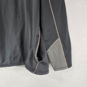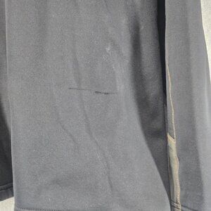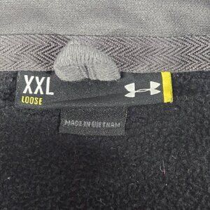 The product is an Under Armour Men's 1/4 zip pullover in a loose fit, designed with the North Dakota Fighting Sioux theme. This top features a solid black color with gray accents and a mock neck and long sleeves. The relaxed fit and 1/4 zip closure make it versatile for various activities such as walking and hockey, perfect for all seasons. With the Under Armour brand and logo accents, this pullover combines style and functionality for the modern man. Jacket does have side pockets.