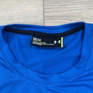 Stay cool and comfortable with the Under Armour Men's Blue and Black Dri-Fit Tank Top. Has UA basketball logo in center front chest area and large Under Armour down the middle back, both have no faded or peeling. Short is in like new condition, no flaws.