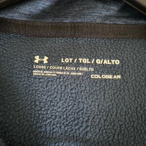 Under Armour Men’s ColdGear Loose Fit Heathered Blue Qtr Zip Pullover, Size Large, excellent condition, no rips or stains. Blue with Black Trim. Measures 23 1/2” across the chest armpit to armpit, 28” in length top of shoulder to the bottom, sleeves 21” from armpit to cuff.