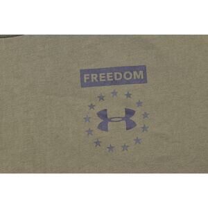 This is a Men's Under Armour Freedom collection t-shirt. It is a loose, fuller cut for complete comfort. The shirt is made from a super-soft, cotton-blend fabric, providing all-day comfort. It features a ribbed collar, short sleeves, and a straight hem. The front has a small patriotic graphic with the word