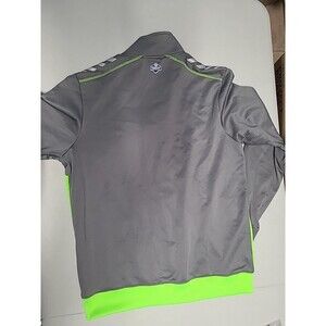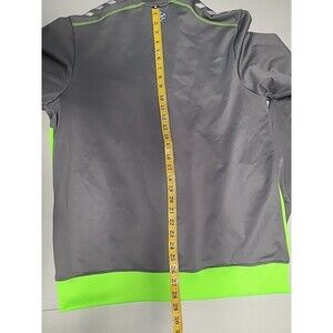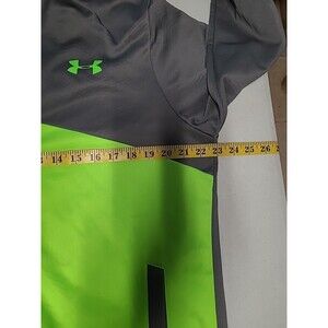 The product is a men's full zip jacket by Under Armour in a grey and fluorescent colorblock design, suitable for activewear. Made of polyester with a stand-up collar and long sleeves, the jacket is designed for athletic fit and is ideal for fall and spring seasons. It features a mid-length cut, machine washable care, and is perfect for outdoor activities, athleisure, and sports like walking, cross training, and running. The jacket is part of the Under Armour Sportstyle/Performance Training product line, making it a versatile and stylish choice for active men. NFI combine authentic . Look closely at the pictures for condition and measurements