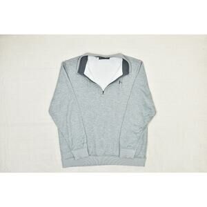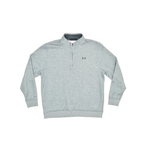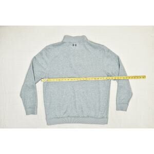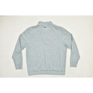 Stay comfortable and versatile with this Under Armour men's 1/4 zip pullover sweater. This heathered gray pullover features a classic stand-up collar and a quarter-zip closure, allowing for adjustable ventilation and easy layering. Designed with a 'Loose' fit, it offers ample room for movement, making it suitable for active wear or casual comfort. The subtle heathered texture adds visual interest, while the embroidered Under Armour logo on the chest signifies athletic quality. This pullover is a men's size XL/TG/EG. It is in excellent used condition with no visible signs of wear, stains, or tears. The armpit to armpit measurement is approximately 25.5 inches, and the length from the shoulder to the hem is about 29 inches. Perfect for golf, cooler weather workouts, or everyday casual wear. Please refer to all images for detailed condition and precise measurements.