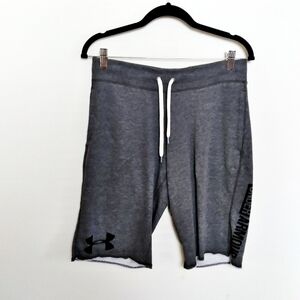 Under Armour men's gray spell out sweatpant material drawstring shorts.