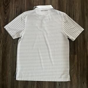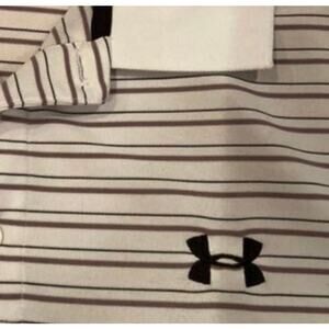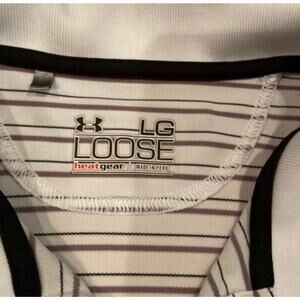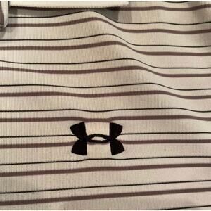 Under Armour men's aize large grey and white striped loose fit heatgear polo shirt. Soft anti pill sweat wicking fabric. Missing top button. Otherwise in excellent condition from a smoke free home.