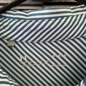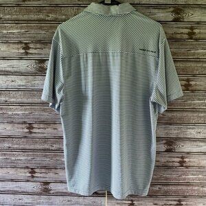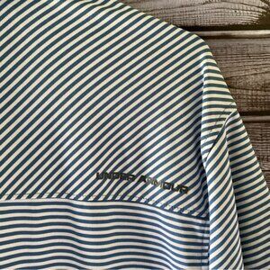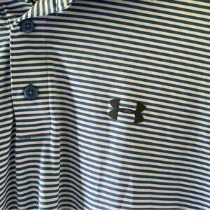 This Men's Loose Heat Gear Short-Sleeved Polo Shirt by Under Armour is a Size L and is made of 88% Polyester and 8% Elastane. It has a blue and white striped pattern with a logo on the front and back as shown. Gently used. Great Condition!