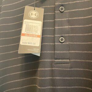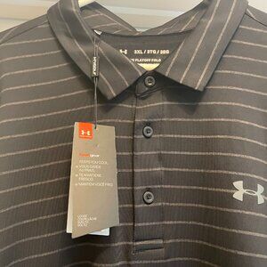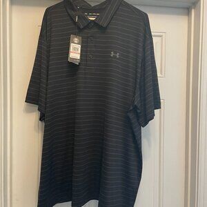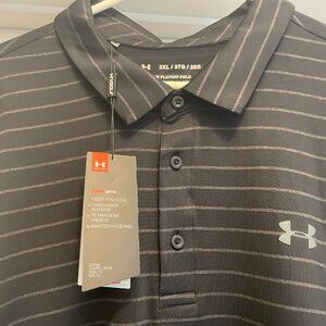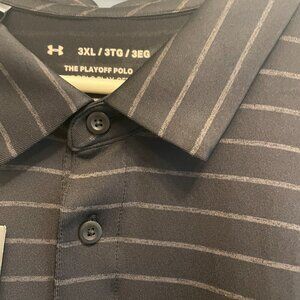 Never Worn - New with tags - short sleeve LE Playoff polo shirt -- under armour brand =size 3xl (mens big and tall) -- Black with charcoal gray stripe golf gear - keeps you cool on hot days