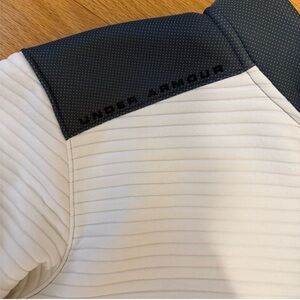 Elevate your wardrobe with this Under Armour zip-up sweater. Features a modern white and gray color scheme. Ideal for versatile styling.