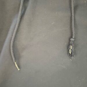 Drawstring on hood. One string is a frayed on end