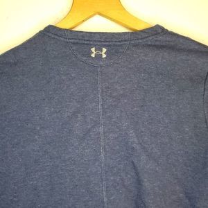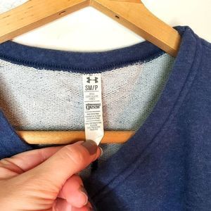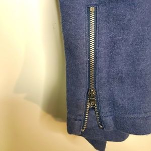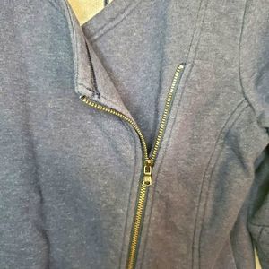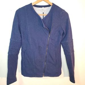 Great pre-owned condition. Under Armour asymmetrical zip-up with quilted elbow patches. Navy blue. Zipper feature on ea. Sleeve at wrist. Moto style. 50% cotton, 20% polyester. Small petite but feel that it would fit a small as well, but hit just at waist.