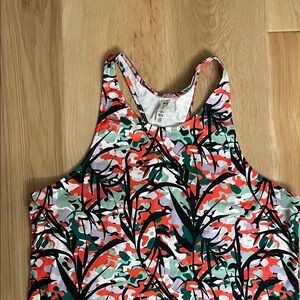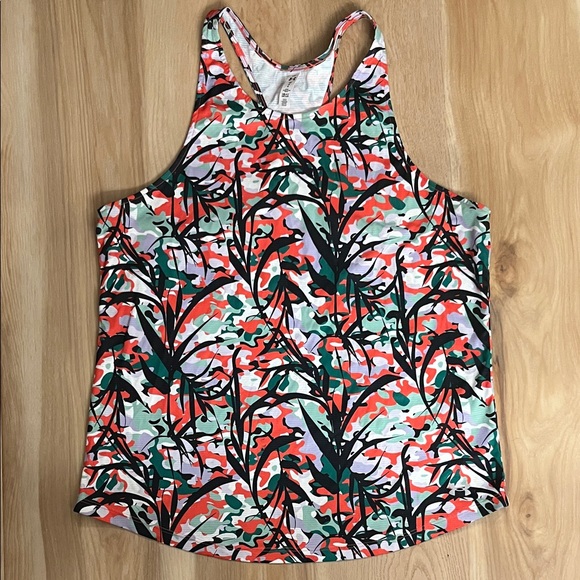 Bold racerback tank with a dynamic multicolor pattern. Perfect for workouts or casual wear. Heat gear.