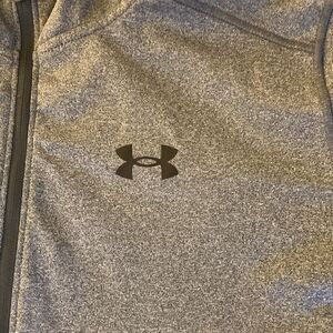 Under Armour NWOT Youth XL 1/4 zip heather gray hoodie with kangaroo pockets & fleece lined. Hood trimmed in black. Black logo on right chest. Long sleeve & rounded bottom.