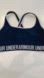 Stylish navy sports bra with white trim. Features Under Armour branding. Ideal for active wear. Color is navy blue. See pictures for measurements.