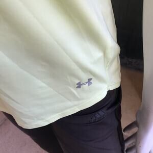 Under Armour Neon Green Yellow Open Back Short Sleeve Shirt Women's Size Large. No inner labels or size tag. Estimating at a large. Measurements: bust: 17, length:24
