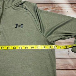 Men's long sleeve shirt. Olive color. Features quarter zip. Under Armour logo on chest.