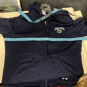 Size medium. Under Armor. Penn State- Navy blue. Pit to pit laying flat is 21 inches. Polyester hoodie. Full zip hoodie and fleece lined. Excellent used condition.