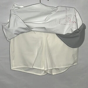 Under Armour Performance Skort - Size 2. Excellent pre-owned condition. White with pink graphic print. 2 front slip pockets and one back welt pocket with button closure, invisible back zipper with slide bar closure, attached undershorts, side splits at hem. Approximate measurements: 15" waist, 15" length, 8" rise, 4" inseam.