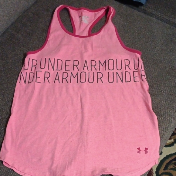 Pink with dark pink trim. Loose fit. Heatgear tank top. From Under Armour. Size YLG.