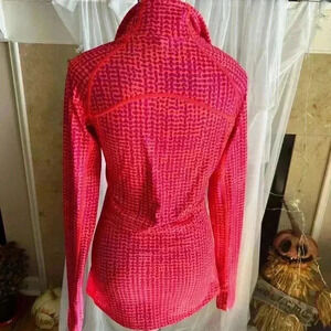 Stylish pink quarter-zip sweatshirt. Comfortable and perfect for casual wear. Features a unique pattern.
