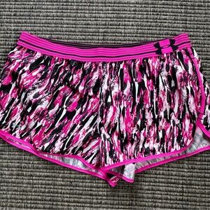 Vibrant athletic shorts with a pink and black pattern. Comfortable fit. Ideal for workouts. Mo tag, but they are XL