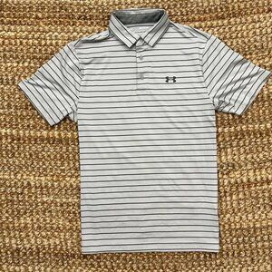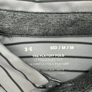 Under Armour Playoff Polo Shirt (Medium) Gray Black Stripe Mens (Men’s). No holes, stains or snags. It’s used but in excellent condition.