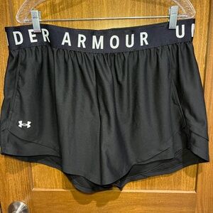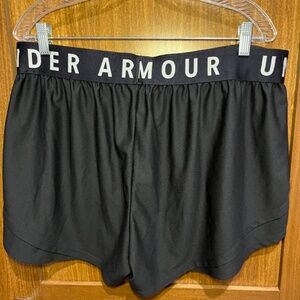 Black Under Armour athletic shorts. These will be your go to pair of shorts for working out or running errand. Super soft knit fabric. They are lightweight and breathable. Anti pill finish for durability. Side hand pockets.