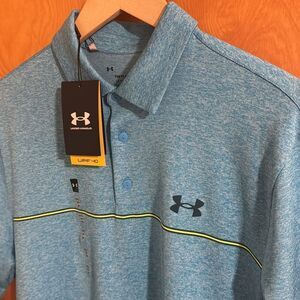 This is new with tags. The color is blue. The fabric is 95 % polyester, 5 % elastane and is wicking. The chest is 44 inches, 22 flat. The length is 29 inches.