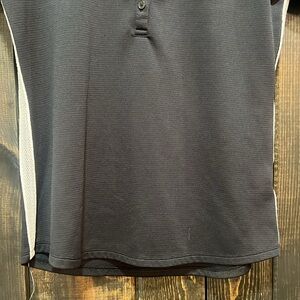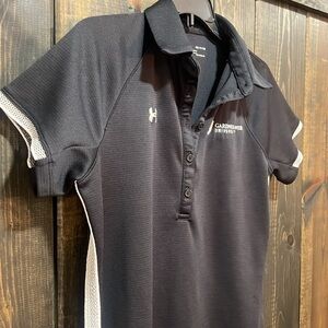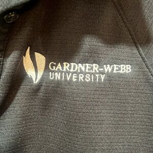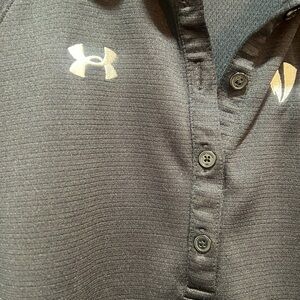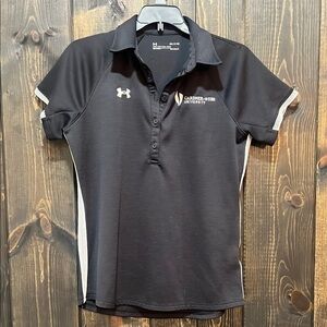 UA brand polo shirt. Size small. Black with white trim. Loose fit. Heatgear. Short sleeves. Moisture wicking fabric. Stretch material. Collared. Embroidered Gardner Webb college logo. NCAA. Preloved. Please see all photos for condition.