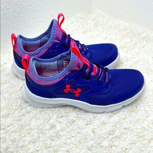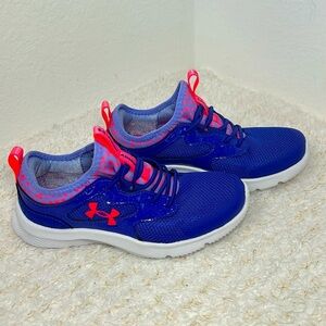 Stylish Under Armour athletic shoes in blue with pink accents. Perfect for sports and casual wear.