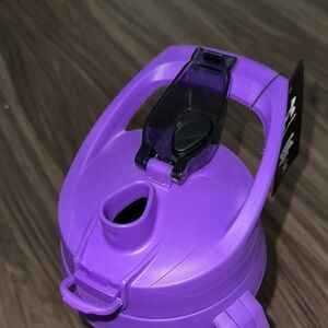Large purple water jug with black and yellow pattern. Sturdy handle and secure lid.