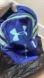 Under Armour backpack in royal blue with mint green details. Features multiple compartments and black base.