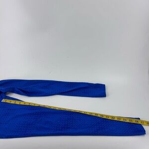 Bold royal blue compression pants with geometric design. Features Under Armour logo on leg.