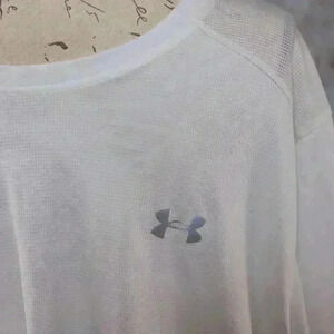 This Under Armour Run fitted shirt in size 2XL features a white background with a subtle geometric star pattern. The short sleeve shirt has a round neckline and pullover closure, making it perfect for casual wear or athletic activities such as walking, running, jogging, volleyball, basketball, and baseball. The shirt is made of breathable, quick-dry, and stretchy fabric, which makes it easy to care for and packable. The collarless design, along with its athletic fit, makes it an ideal activewear top for men. This shirt is perfect for those who want to enjoy the summer, fall, and spring seasons without worrying about the condition of their clothing.