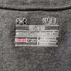 Charcoal gray Under Armour graphic tee - v neck and short sleeve. Semi fitted giving a slimmer fit for a sleeker, more feminine silhouette without the squeeze. Soft cotton gives all day comfort and performance while wicking away sweat & drying really fast. Anti-odor technology prevents the growth of odor-causing microbes. Extended body length delivers the perfect amount of coverage. EUC