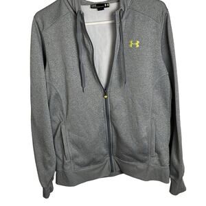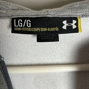 Under Armour Semi-Fitted Hoodie. Zip Up Jacket in Gray. Size Large. Pockets on the front. Ribbing on cuffs, hood and bottom of jacket. Armpit to armpit is 20 inches. Shoulder to hem is 26 inches. Smoke and pet free environment.