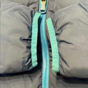 Sleek Under Armour jacket in a shiny blue finish. Perfect for cold weather. small flaw on the hood and some letters on the hood are peeling.