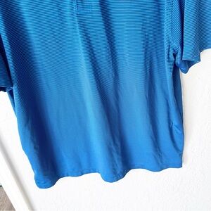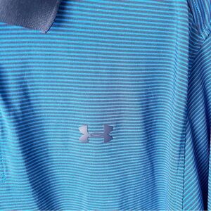 DETAILS: Under Armour shirt men's 2X, blue striped style, quarter button polo, loose fit, Heatgear collection. Poly spandex, machine wash.