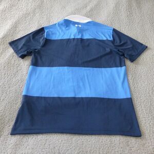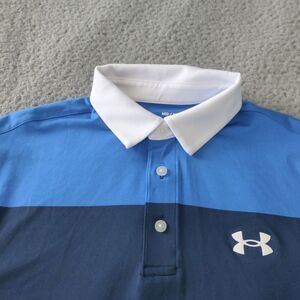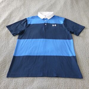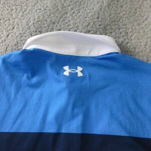 Under Armour Shirt Mens Medium Playoff Polo Blue Striped Golf Performance. Excellent preowned condition. See pics for measurements and details.