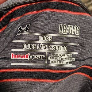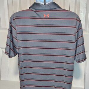 Under Armour, Short Sleeve Polo, Grey, Large, orange and black stripes. Loose fitting, stretch fabric, poly elastane blend. very good condition, good for Golf.