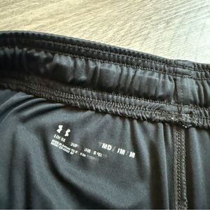Kick off summer right with these sporty Under Armour youth medium boys shorts. Black with grey and white logo/accents, side hand pockets and a comfortable elastic drawstring waistband. Internal drawstrings. Material: 100% polyester. Please see photos for small signs of normal wear from use.