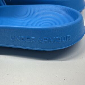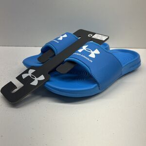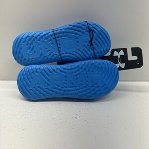 The product is a pair of Under Armour boys sandals in size 4, featuring a slip-on style in a vibrant blue color. These shoes are designed specifically for boys and are perfect for active young boys who love to play and be outdoors. With the Under Armour brand reputation for quality and performance, these sandals are sure to be durable and comfortable for all-day wear.