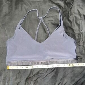 Keywords: Under Armour, sports bra, gray, racerback, medium support, workout, activewear, athletic, gym, yoga, running, training, fitness, comfortable, Under Armour bra