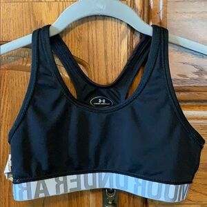 Black UA youth sports bra. Fitted heat gear. Measures approximately 12” across and 10” down.