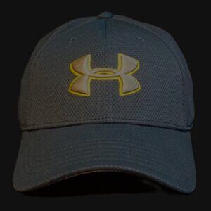Under Armour Fitted Hat. Men’s Size L/XL. Storm Blue Hat with Grey and Yellow UA Embroidered Logo. 100% Polyester. Great Used Condition.