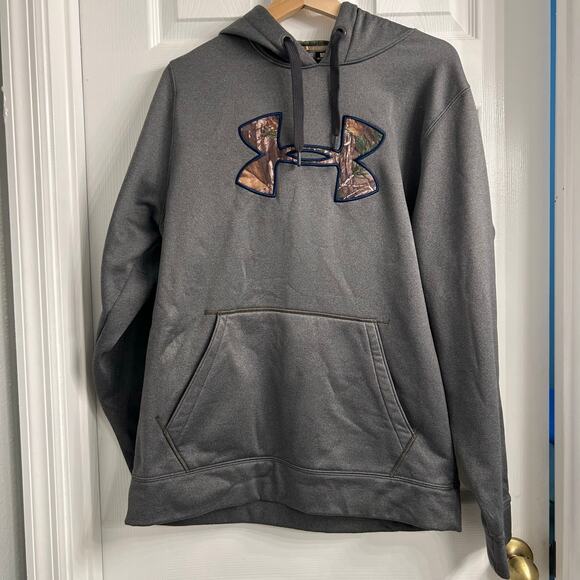 Under Armour Storm pullover hoodie in men’s size Medium. Features a gray exterior with a Realtree-style camo UA logo and matching camo hood lining. Soft fleece interior, front kangaroo pocket, and UA Storm water-resistant fabric.