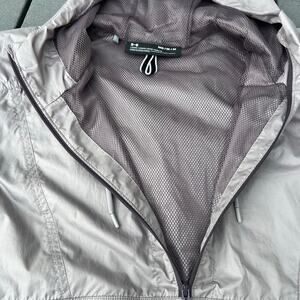 Under Armour size M loose fit, storm jacket. Light dusty mauve color. Has hood, 1/4 zipper, 2 front snap pockets. Elastic waist & sleeves. Mesh lined. Very lightweight! Polyester.