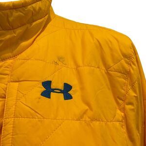 Under Armour Storm1 Packable, ColdGear Infrared Micro Jacket - sz LARGE - unisex - yellow color - has pockets - magnetic on the bottom of the zipper - long sleeved - semi puffer - zippered down PRE OWNED with some wear, small stains Please check photos since they are part of my description