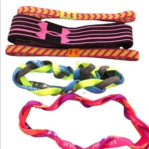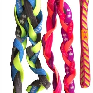 NWOT Set of 5 Colorful Under Armour Stretchy Sport Headbands. One 1.15” in width/2 striped at .2” and 2 braided.25”. Perfect for sports or everyday. Nice assortment. From a smoke free home. They will be loose bagged together.