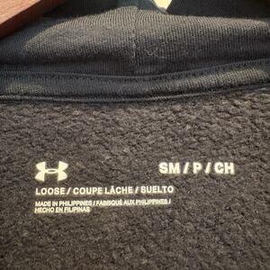 This Under Armour sweatshirt is a men's size small in black, featuring a relaxed fit with a drawstring closure and long sleeves.